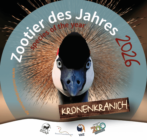 Seine elegante Erscheinung, die goldschimmernde Federkrone, der weittragende Ruf und sein anmutiger Tanz machen ihn zu einem äußerst attraktiven Botschafter für seine Art und seine gefährdeten Lebensräume. Die Zoologische Gesellschaft für Arten- und Populationsschutz (ZGAP) ernennt den Kronenkranich zum Zootier des Jahres 2026. Mit dieser Auszeichnung möchten die Kampagnenpartner auf die zunehmenden Bedrohungen für den Kronenkranich und für afrikanische Feuchtgebiete und kleinbäuerliche Kulturlandschaften als seine bevorzugten Lebensräume, aufmerksam machen. Das öffentliche Bewusstsein für seinen Schutz muss gestärkt werden.