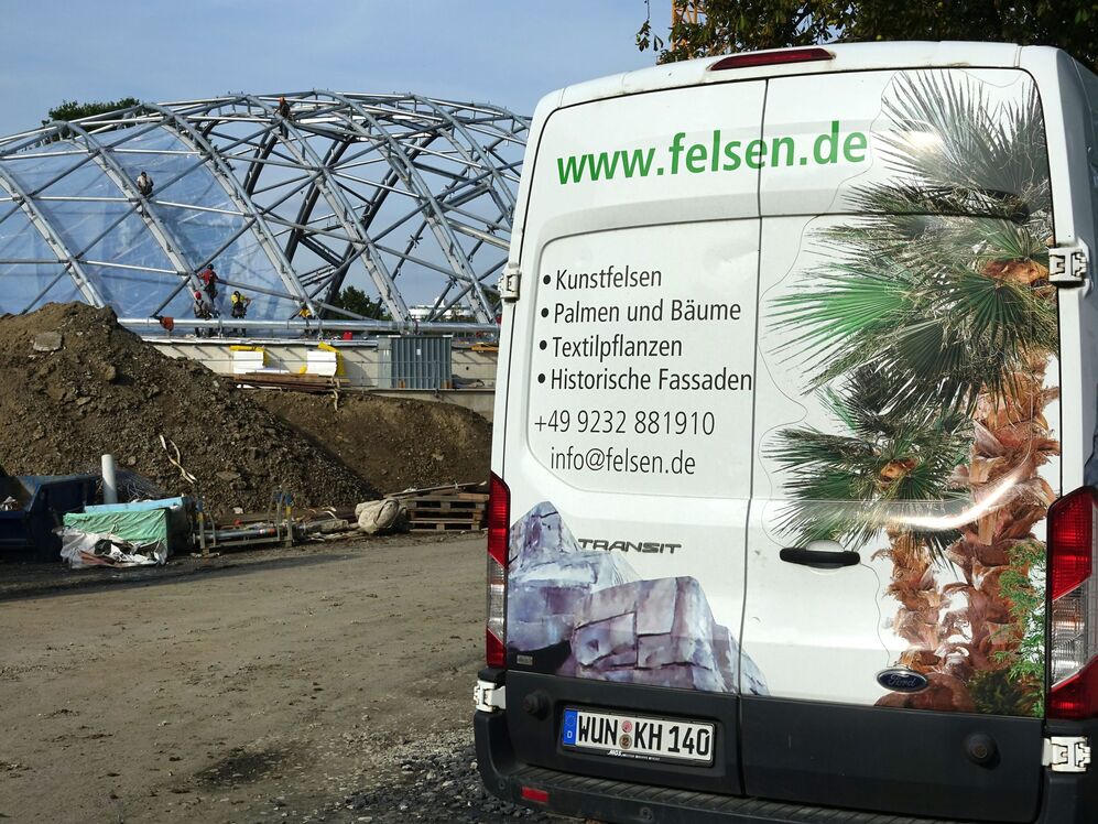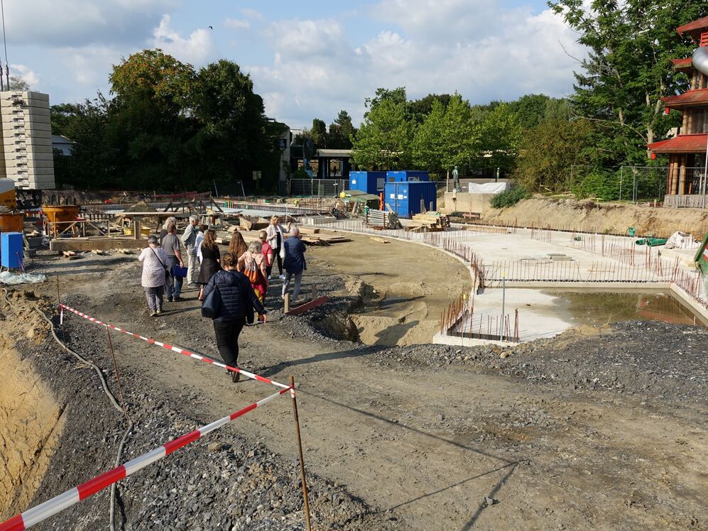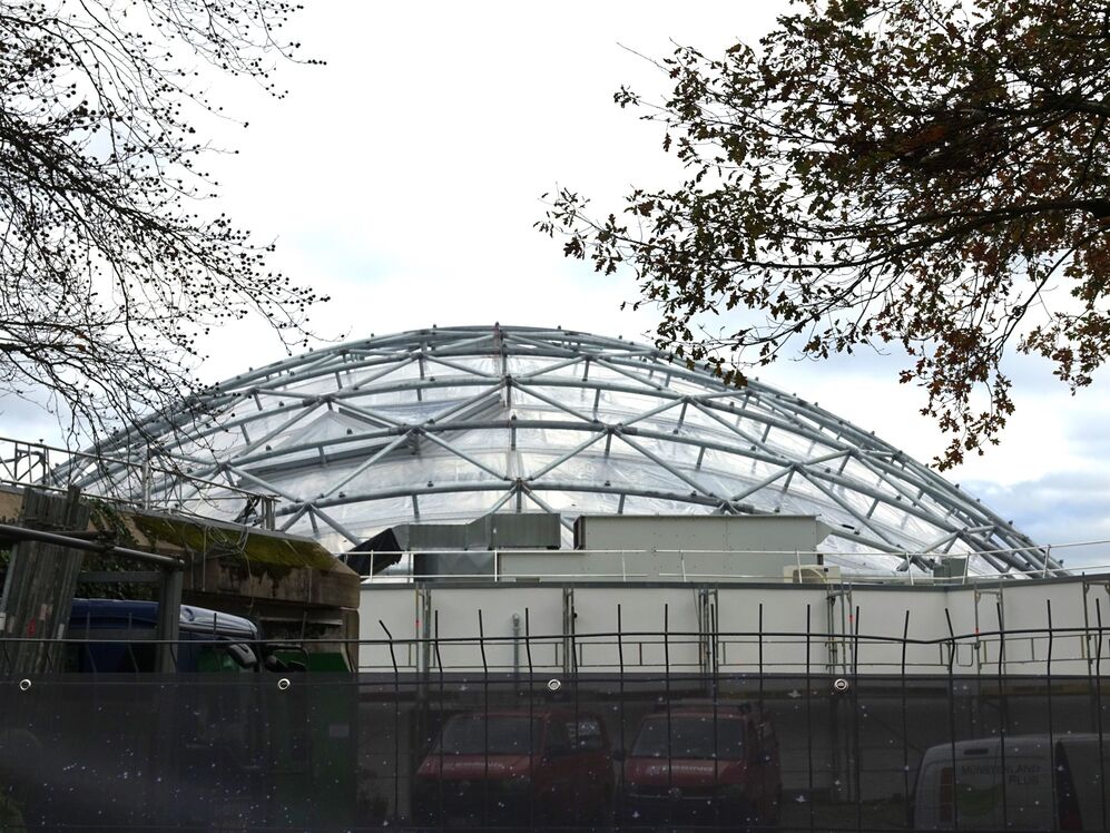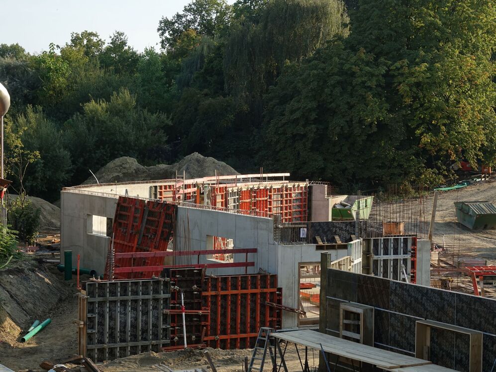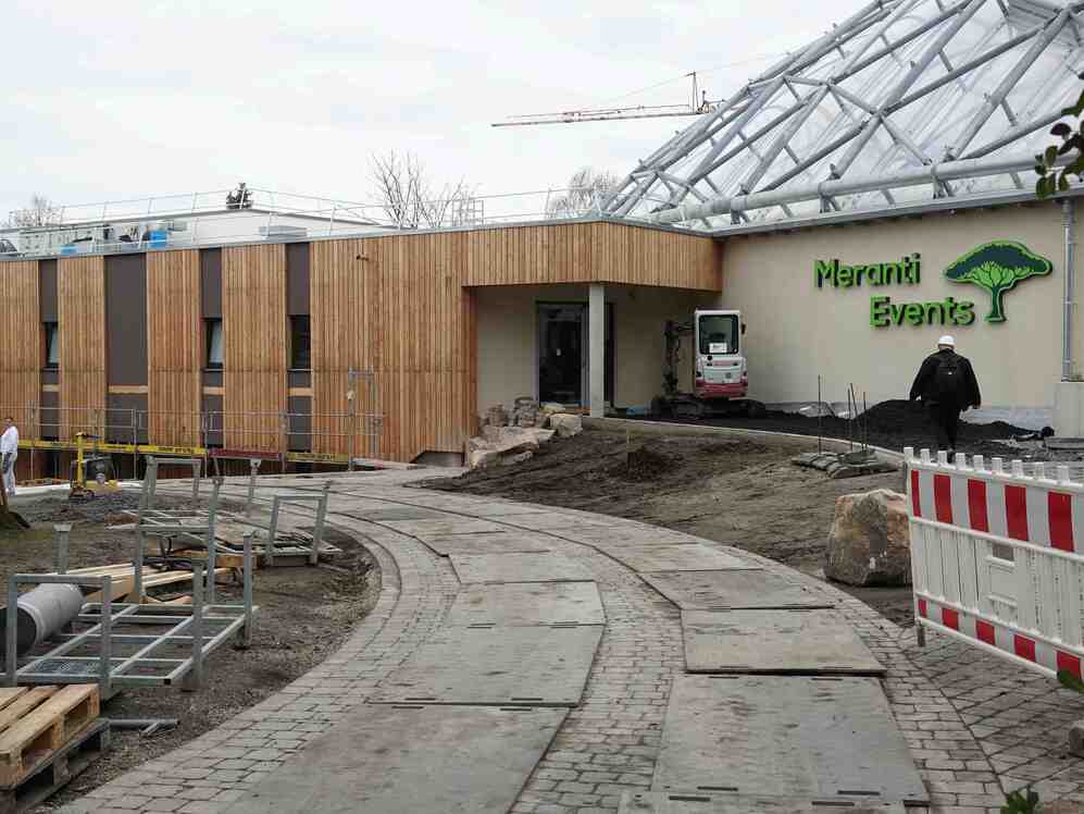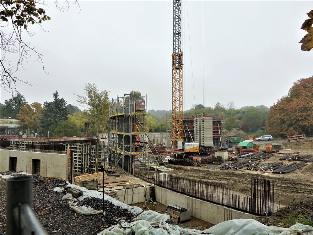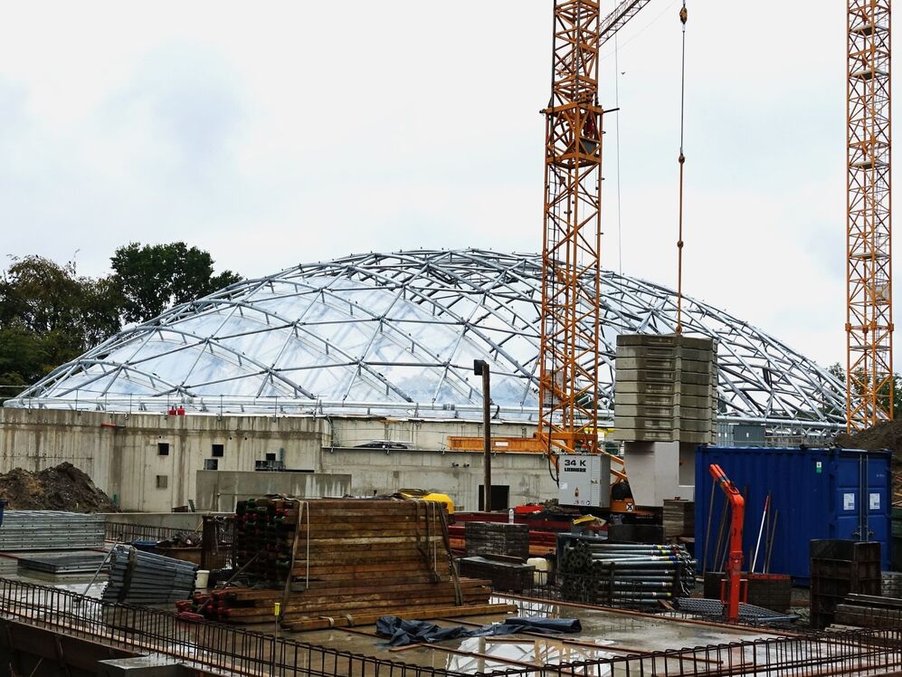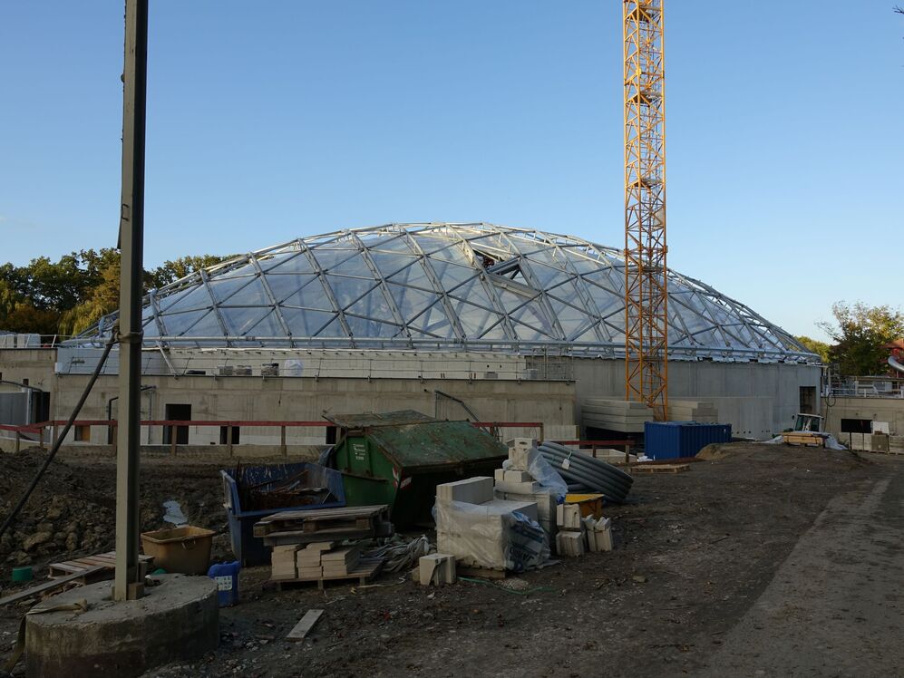 Nachdem die Außenmauern stehen, kann man die Größe der neuen Tropenhalle erkennen. Neben dem Ausbau weiterer Außenanlagen geht es nun an den Innenausbau. Lieferschwierigkeiten verhindern zur Zeit noch die Dachkonstruktion.