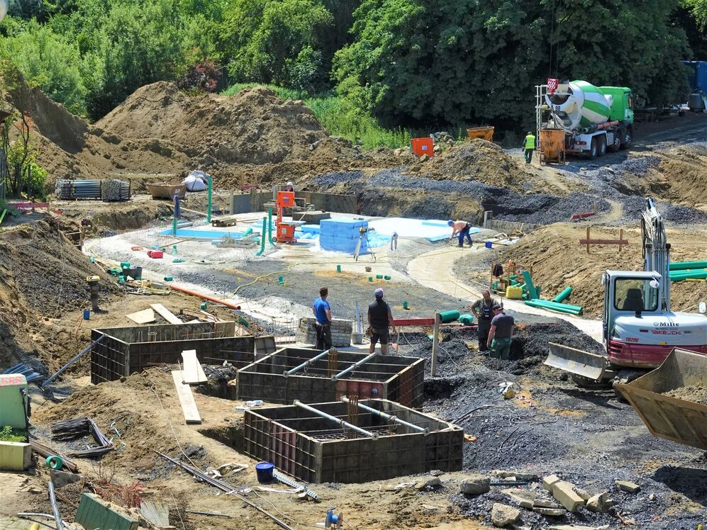 Bei fortlaufenden Einschalungs- und Betonierarbeiten sind die ersten Betowände schon ausgeschalt und sichtbar. Auch ist der größte Teil des riesigen Erdhaufens verarbeitet bzw. abgefahren.