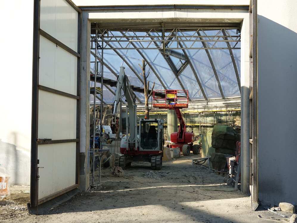 Mitlerweile ist das Foliendach fertiggestellt und das Innere der Halle nimmt Gestalt an. Die kahlen Betonwände sind zum größten Teil verschwunden und durch die Arbeit der Kunstfelsbauer sind die einzelnen Gehege schon zu erkennen.