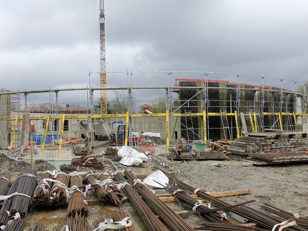 Mittlerweile ist ein zweiter Baukran aufgestellt worden. Nun können an zwei Stellen Einschal- und Betonierarbeiten durchgeführt werde.