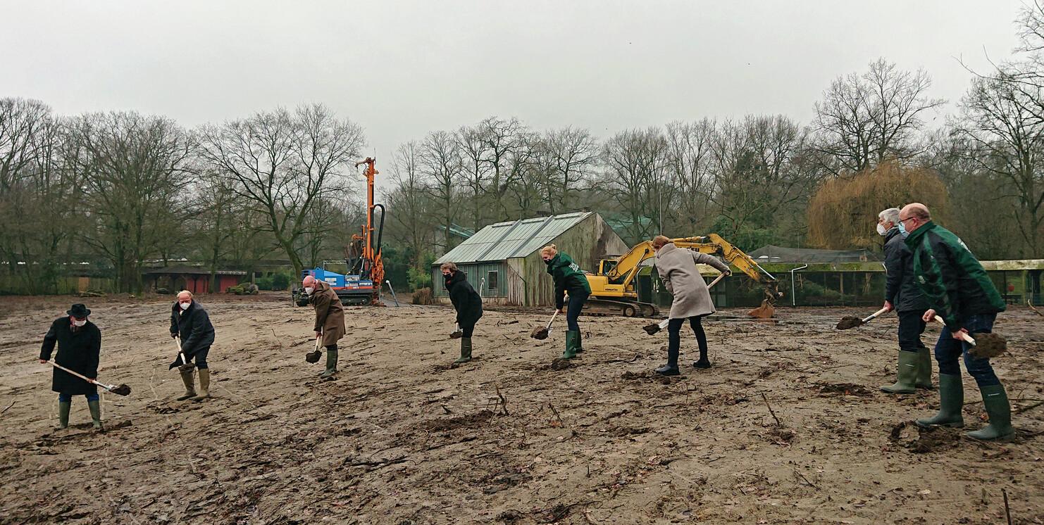 Der Erste Spatenstich für die neue Meranti-Halle wurde im relativ kleinen Kreis abgehalten. Neben Mitgliedern des Allwetterzoos und der Projektfirma BAnTec GmbH, waren unter anderem der Aufsichtsratsvorsitzende Dr. Ludger Hellenthal, der Vorsitzende des Zoo-Vereins, Helge Peters, sowie von der Stadt Münster der Oberbürgermeister Markus Lewe und die Kämmerin Christine Zeller bei diesem Symbolträchtigen Event anwesend. "Wir hätten gerne deutlich mehr Menschen eingeladen und diesen Tag richtig groß mit allen gefeiert, aber Corona hat uns da einen Strich durch die Rechnung gemacht", eröffnete Sebastian Rohlig von der Pressestelle des Allwetterzoos den Termin.