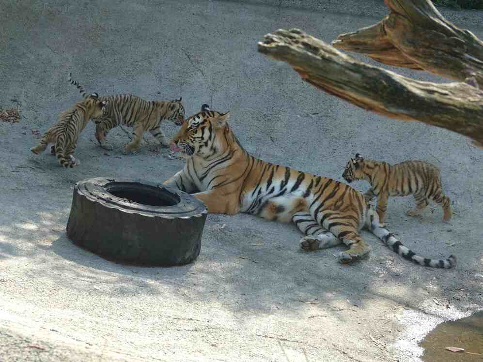 Die vier am 30. Mai geborenen Sibirischen Tigerjungen erkunden seit dem Wochenende mit ihrer Mutter Raya die Außenanlage des Tigergeheges. Fedor, der Vater der Jungen (3 Männchen und ein Weibchen), kann sie nur durch ei Gitter sehen, da ein direkter Kontakt für die Kleinen noch zu gefährlich wäre.