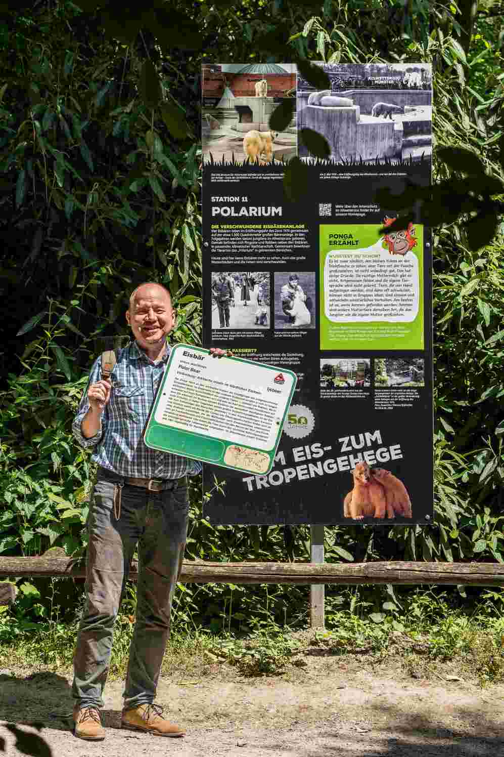 Beim monatlichen Zoorundgang im Juni konnten die Teilnehmer, geführt von Vorstandsmitglied Michael Sinder, "50 Jahre Allwetterzoo, vom Betonzoo zum modernen Artenschutzzoo" erleben. An Schautafeln, die an verschiedenen Stellen im Zoo zum Jubiläum aufgestellt wurden, wurde diese Entwicklung dargestellt.