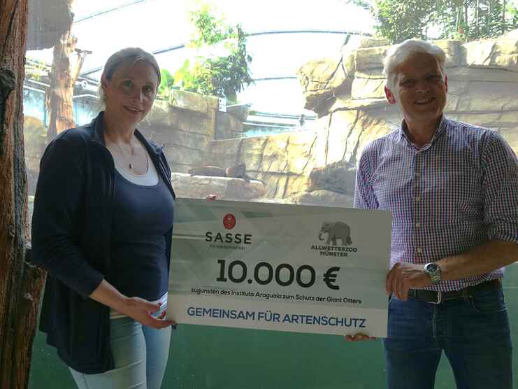 Der am 26.09. an den Allwetterzoo übergebene Betrag geht an das brasilianische "Instituto Araguaia", eine Organisation die den Lebensraum des Riesenotters, Leittier der Meranti-Halle, vor Überfischung und Wilderei schützt.