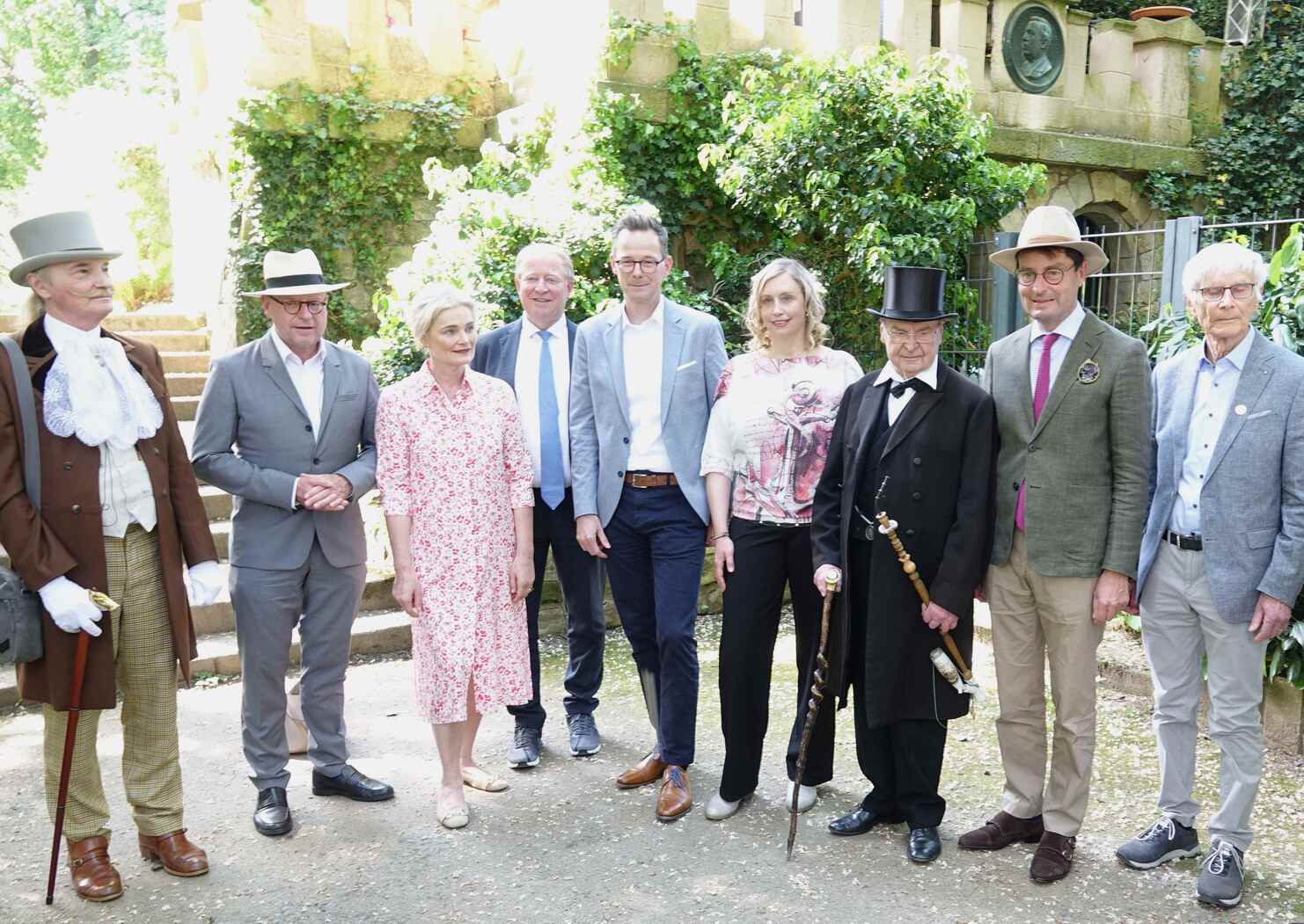 Begleitet von Zoogründer Professor Landois und dem Tollen Bomberg (dargestellt von der AZG) versammelten sich vor der Tuckesburg (v.r.) Vereinsvorsitzender Helge Peters, Regierungspräsident Andreas Bothe, Zoodirektorin Dr. Simone Schehka, Frank Demmer von der LBS, Aufsichtsratsvorsitzender Dr. Ludger Hellenthal, Bürgermeisterin Angela Stähler und Oberbürgermeister Markus Lewe.
