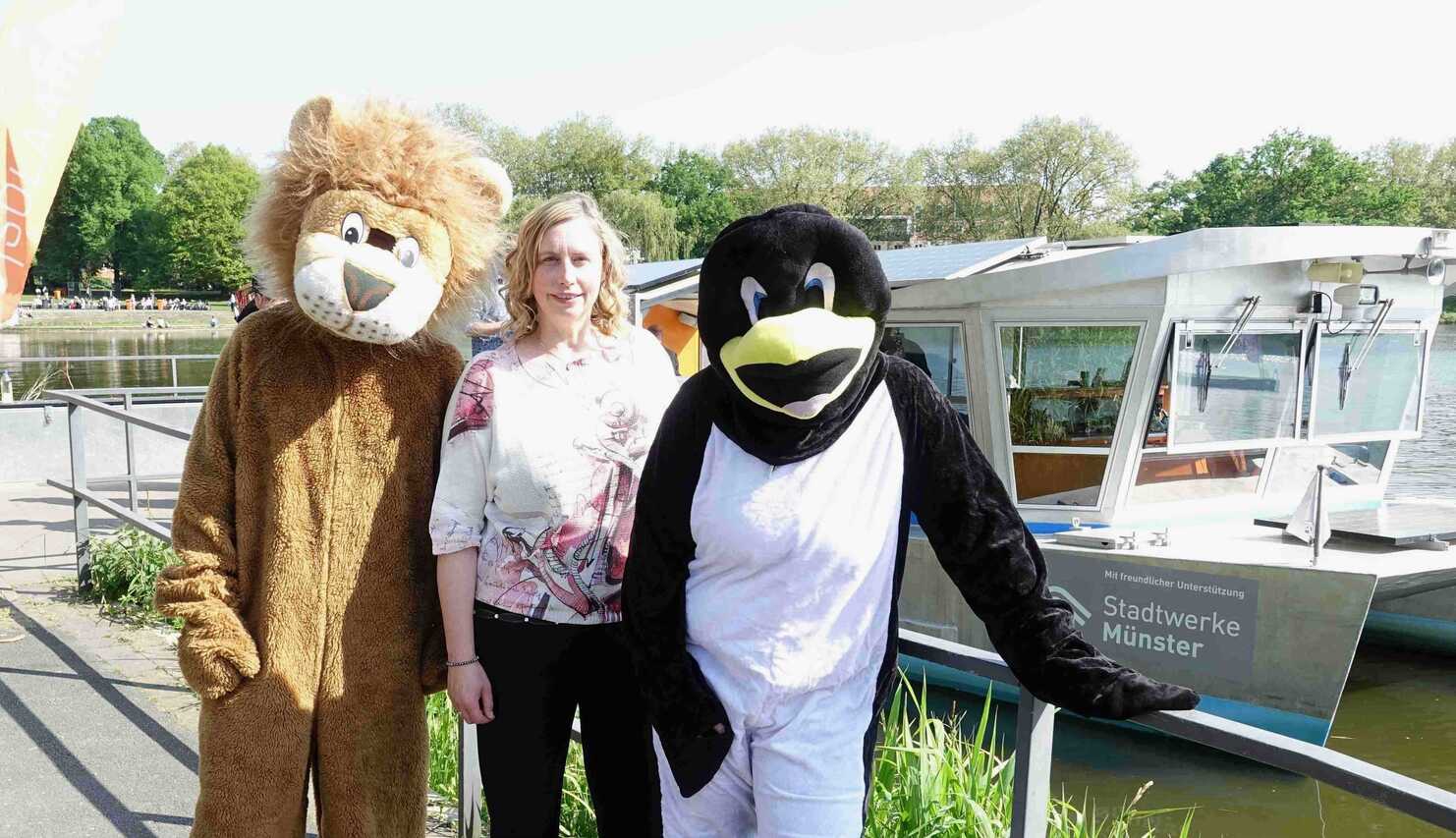 Löwe und Pinguin begleiteten Zoodirektorin Dr. Simone Schehka auf der Fahrt mit der Solaris zum Allwetterzoo.