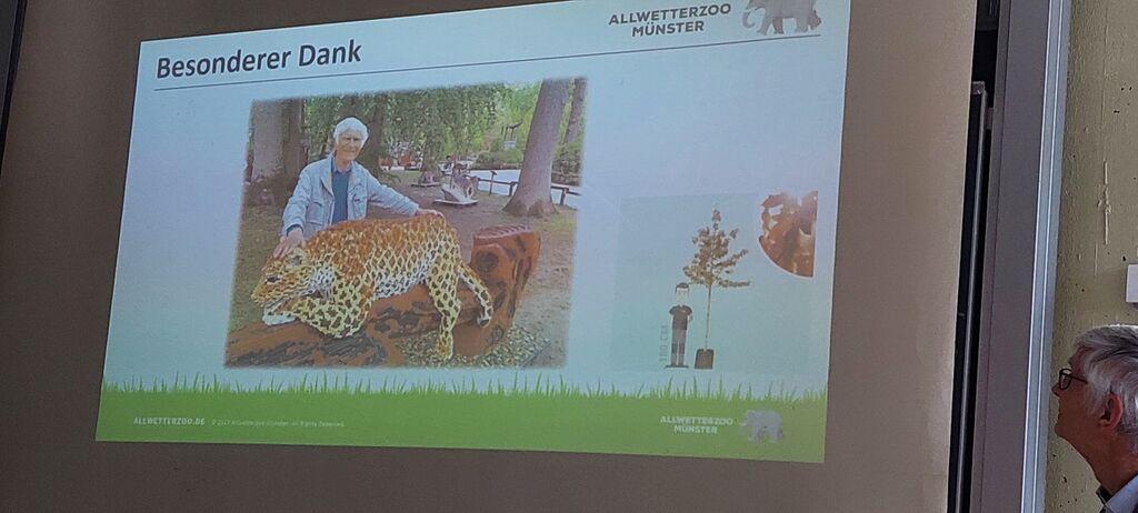 Frau Dr. Katharina Krüger, die neugewählte Vorsitzende des Vereins, hielt die Laudatio für Herrn Peters: "Helge Peters hinterlässt nach 31 Jahren Mitgliedschaft im Zoo-Verein und 18 Jahren als dessen Vorsitzender ein finanziell solides Fundament, eine in dieser Zeit von 500 auf 18.000 gewachsene Mitgliederbasis und eine von gegenseitiger Wertschätzung geprägte Vereinskultur." Für sein langjähriges Engagement bedankte sich der Zoo-Verein mit Standing Ovations, der Ehrenmitgliedschaft des Vereins und einer lebenslangen Zoopatenschaft für einen Geparden, einem Tier, dem sich Helge Peters besonders verbunden fühlt. Vor vielen Jahren hat er dem Allwetterzoo die Bronzeskulptur eines Gepards geschenkt, den „Schreitenden Gepard“ von Jochen Ihle.