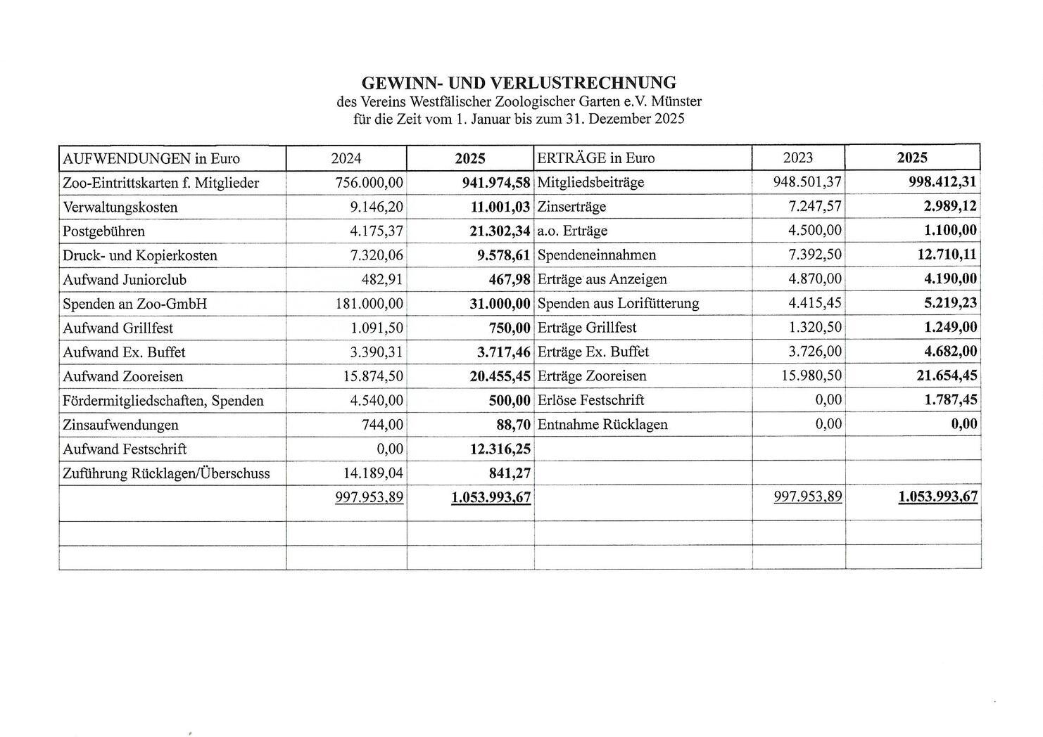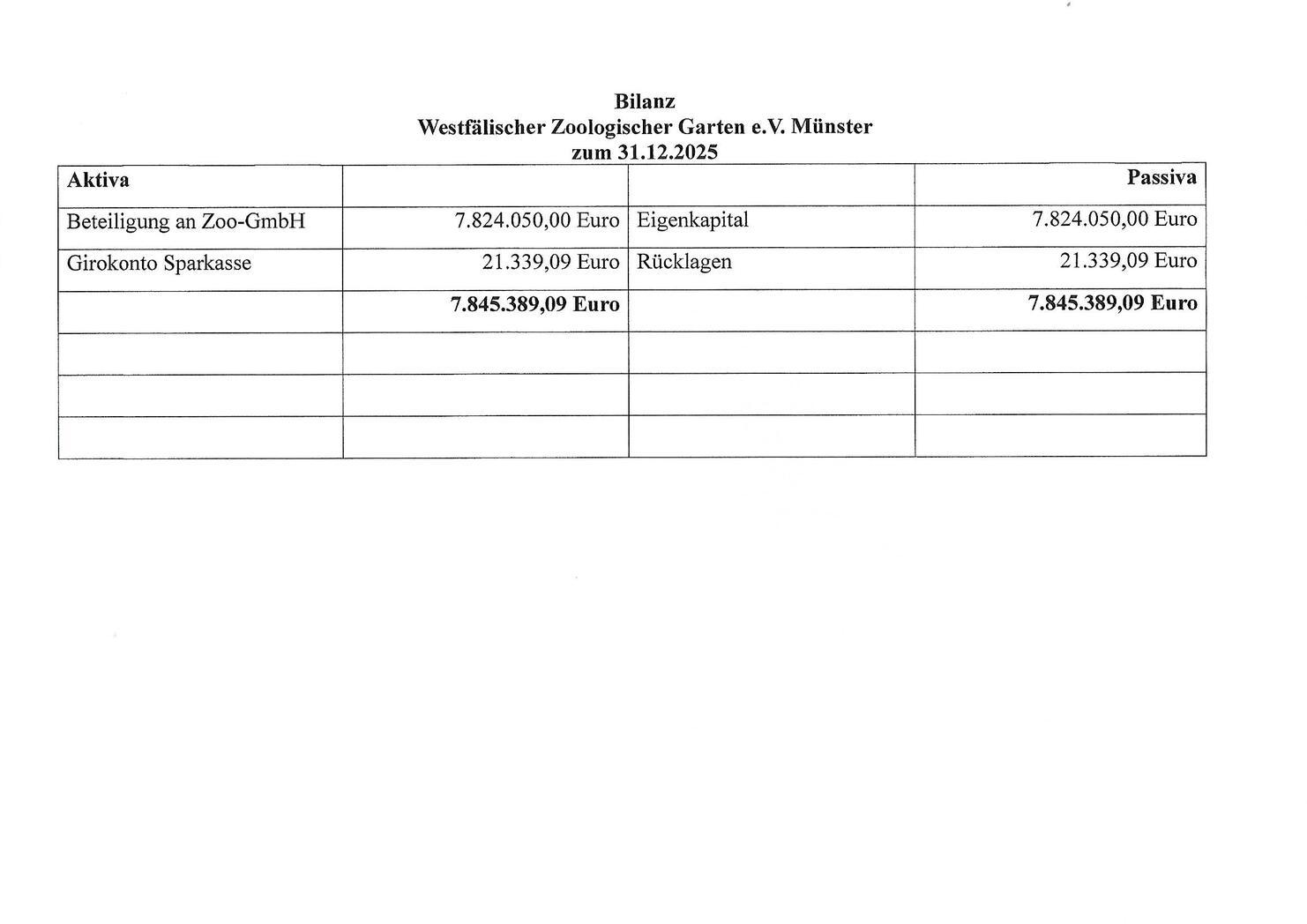| TOP 3 | Vorlage der Bilanzen zum 31.12.2025 und der Erfolgsrechnung 2025 H.J. Krampe stellt die Bilanzen und die jeweiligen Gewinn- und Verlustrechnungen des Jahres 2025 vor. Auch die Spenden des Zoovereins werden direkt benannt. |