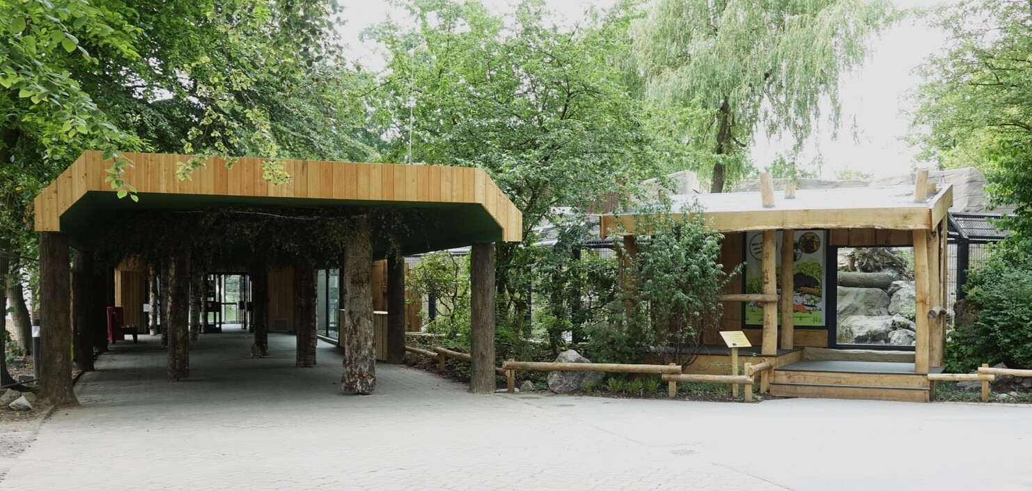 Der neugestalltete Eingangsbereich zum Bärenhaus und rechts der Info- und Beobachtungsstand Rothunde